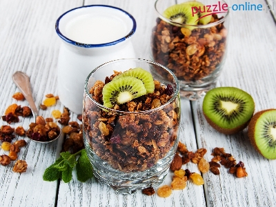 Szklanki, Granola, Rodzynki, Orzechy, Mleko, Kiwi, Śniadanie, Płatki, Łyżeczka