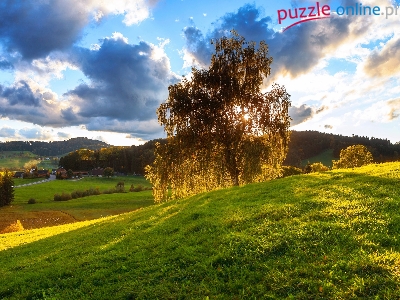 Słońce, Drzewo, Domy, łąka, Brzoza, Wzgórza