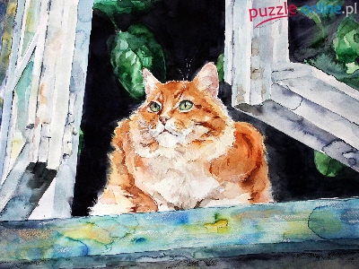 Kot, Natalia Chizhova, Malarstwo, Okno, Liście, Rudy, Obraz, Obraz
