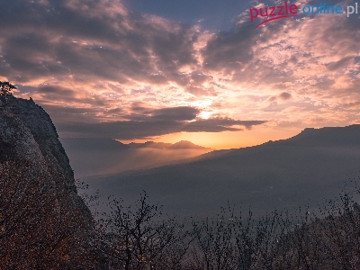 Mgła, Skały, Chmury, Góry, Drzewa, Zachód słońca
