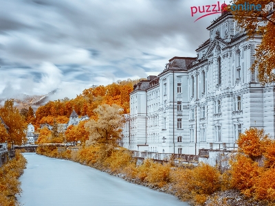 Drzewa, Most, Chmury, Kanał, Domy, Rzeka, Jesień