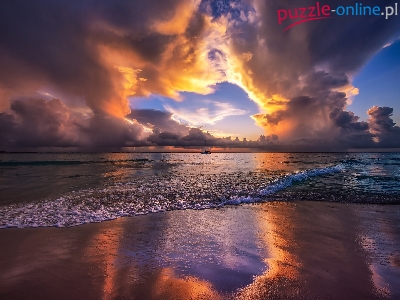 Fale, Morze Karaibskie, Odbicie, Plaża, Meksyk, Chmury, Zachód słońca, Żaglówka, Isla Mujeres