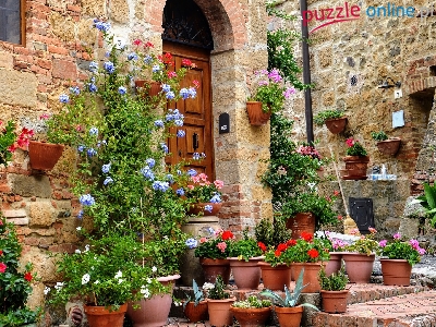 Drzwi, Ściana, Kwiaty, Dom, Schody, Donice