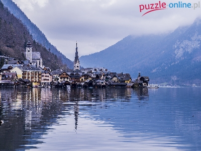 Hallstatt, Domy, Chmury, Jezioro Hallstattersee, Austria, Góry Alpy Salzburskie, Kościół