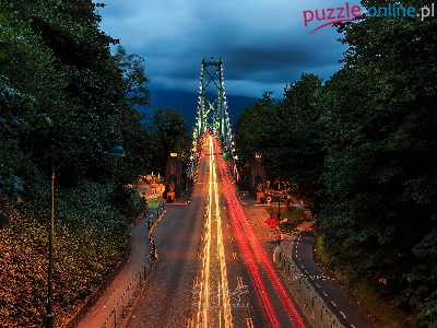 Lions Gate Bridge, Drzewa, Kanada, Światła, Most, Noc, Vancouver