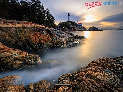 Drzewa, Cieśnina Strait of Georgia, Kanada, Latarnia morska Point Atkinson, Skały, Wschód słońca, Vancouver