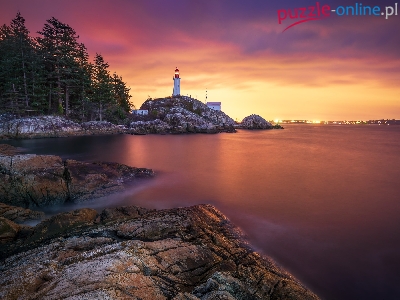 Wschód słońca, Cieśnina Strait of Georgia, Kanada, Latarnia morska Point Atkinson, Drzewa, Skały, Vancouver