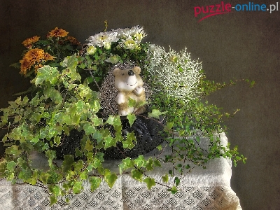 Bluszcz, Jeż, Grafika, Figurka, Rośliny, Koszyk, Serweta