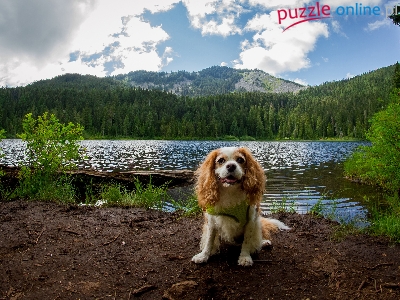 Rzeka, Góry, Pies, King charles spaniel, Drzewa