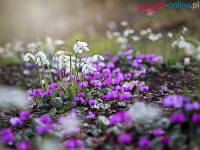 Puzzle Przebiśniegi, Polana, Kwiaty, Fiołki