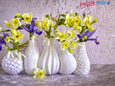 Irysy, Wazony, Kwiaty, Narcyzy żonkile, Białe
