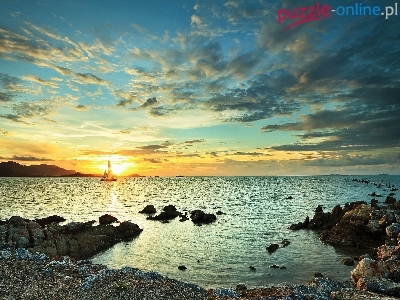 Zachód słońca, Kamienie, Morze, Żaglówka, Chmury