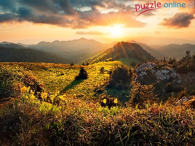 Kwiaty, Skała, Chmury, Góry, Promienie słońca, Rośliny