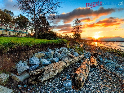 Drzewa, Brzeg, Chmury, Morze, Kamienie, Wschód słońca