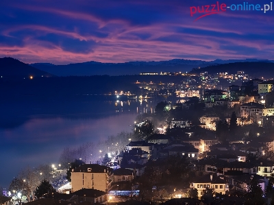 Zmierzch, Góry, Domy, Kastoria, Grecja, Oświetlone, Jezioro Kastoria, Zachód słońca, Macedonia Zachodnia