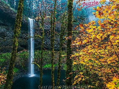 Las, Stany Zjednoczone, Park miejski Silver Falls, Drzewa, Skała, Wodospad South Falls, Jesień, Oregon