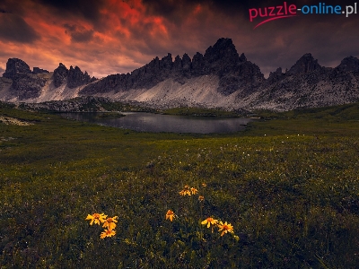 Szczyt Monte Paterno, Dolomity, Żółte, Kwiaty, Włochy, Łąka, Góry, Jezioro, Zachód słońca