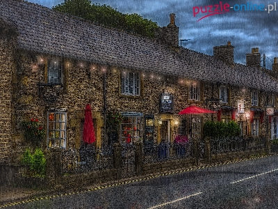 Ogrodzenie, Kawiarenka, Ulica, Dom, Stoliki, Deszcz