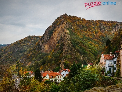 Lasy, Domy, Austria, Jesień, Góry, Drzewa, Durnstein