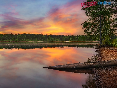 Konar, Jezioro, Drzewa, Zachód słońca, Suchy, Las