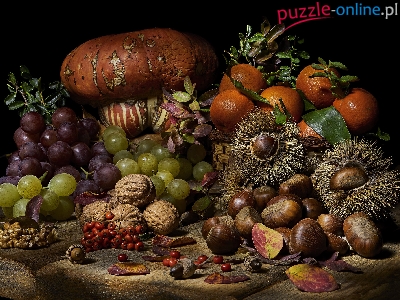 Mandarynki, Dynia, Liście, Warzywa, Kompozycja, Orzechy, Winogrona, Owoce, Kasztany jadalne, Jarzębina
