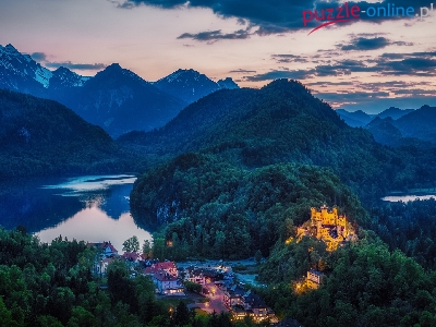 Zamek Hohenschwangau, Noc, Góry, Lasy, Bawaria, Jezioro Schwan, Jezioro Alpsee, Niemcy, Światła, Chmury, Jeziora, Domy, Gmina Schwangau