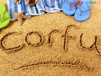 Piasek, Morze, Klapki, Ręcznik, Rozgwiazda, Corfu, Wakacje, Napis, Muszelki