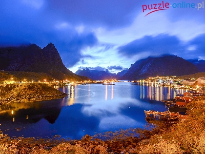Góry, Lofoty, Oświetlone, Domy, Norwegia, Jesień, Morze Norweskie, Drzewa, Wioska Reine