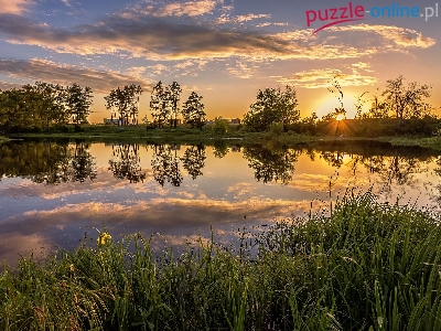 Wschód słońca, Drzewa, Odbicie, Staw, Trawy, Chmury