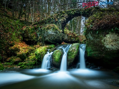 Wodospad Schiessentumpel, Drzewa, Skały, Mała Szwajcaria, Luksemburg, Most, Las, Rzeka, Mullerthal