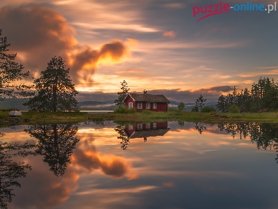 Jezioro Vaeleren, Norwegia, Odbicie, Chmury, Drzewa, Zachód słońca, Dom, Gmina Ringerike