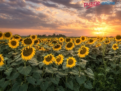Puzzle Chmury, Słoneczniki, Pole, Wschód słońca