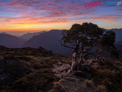 Skały, Chmury, Góry, Sosna, Zachód słońca
