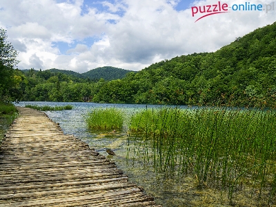 Lasy, Chorwacja, Pomost, Drzewa, Jezioro, Wzgórze, Trawa, Park Narodowy Jezior Plitwickich