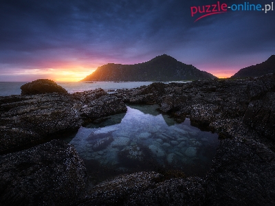 Góra, Chmury, Morze, Skały, Zachód słońca