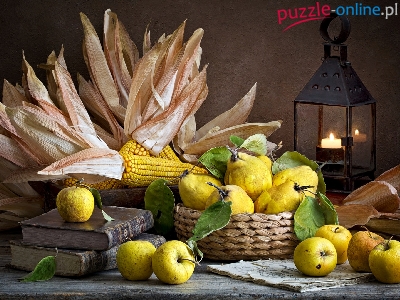Gruszki, Kukurydza, Lampion, Kompozycja, Jabłka, Książki