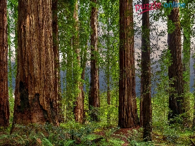 Drzewa, Stany Zjednoczone, Park Narodowy Redwood, Sekwoje, Paprocie, Las, Pnie, Kalifornia
