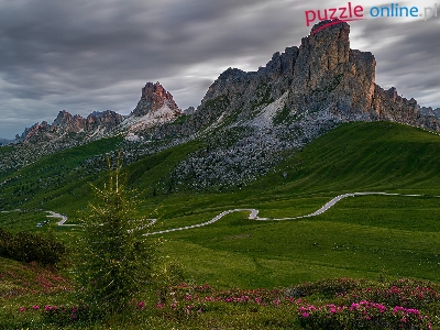 Dolomity, Droga, Drzewo, Góra Ra Gusela, Włochy, Giau Pass, Belluno, Łąki, Góry, Kręta, Kwiaty