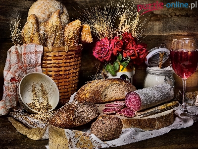 Kieliszek, Kłosy, Nóż, Chleb, Róże, Wino, Koszyk, Pieczywo, Kiełbasa, Deska