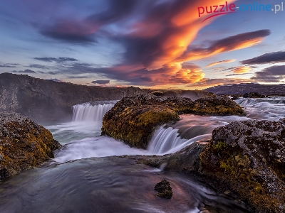 Skały, Islandia, Rzeka, Wodospad Godafoss, Chmury
