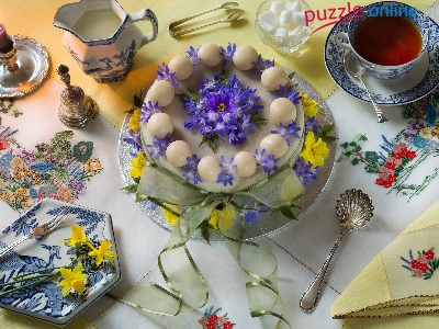 Ciasto, Herbata, Łyżeczki, Widelce, Kwiaty, Dzbanek, Kompozycja, Świeczka, Serwetki