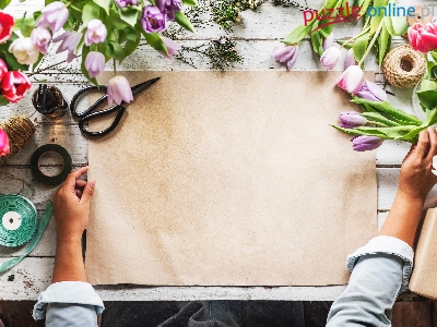 Puzzle Dłonie, Tulipany, Stół, Kompozycja