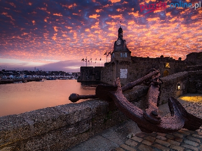 Wieża, Chmury, Kotwica, Rzeka, Zachód słońca, Mury