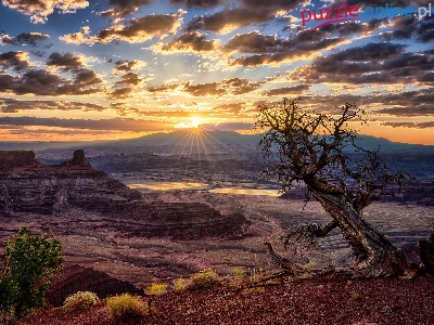 Suchy, Kanion, Drzewo, Zachód słońca, Skały, Konar