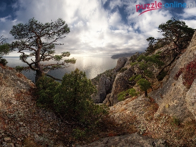 Drzewa, Góry, Chmury, Morze, Skały, Sosny