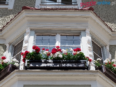 Dom, Donice, Pelargonie Pelargonia, Wykusz, Ściana, Okno, Kwiaty