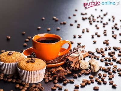 Filiżanka, Cukier, Anyż gwiazdkowy, Kawa, Cynamon, Pomarańczowa, Ziarna, Muffinki