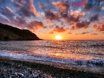 Wieczór, Góry, Morze, Zachód słońca, Chmury