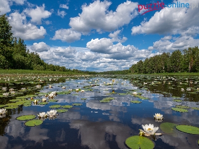 Lilie wodne, Drzewa, Chmury, Lasy, Białe, Rzeka, Niebo