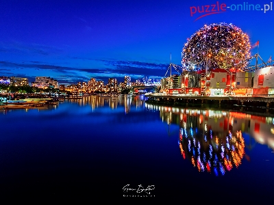 Science World at TELUS, Muzeum Nauki, Oświetlone, Miasto nocą, Kanada, Łódki, Kopuła, Rzeka Fraser, Vancouver